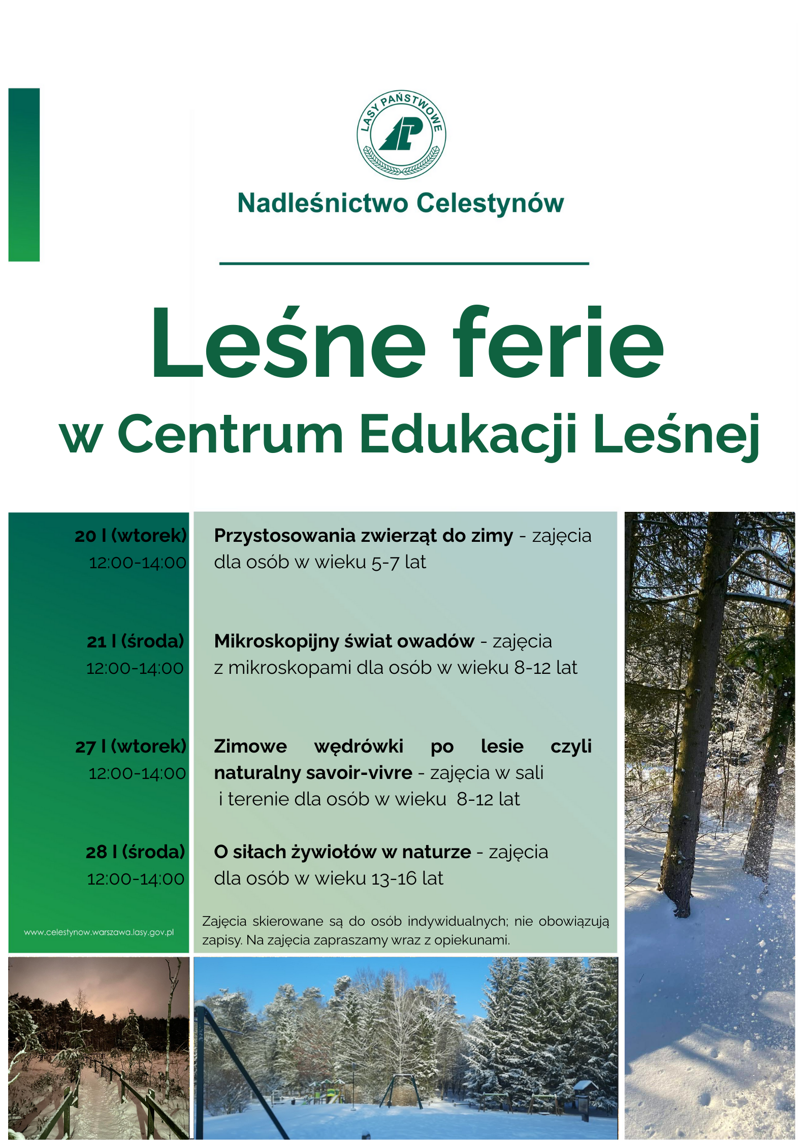 Nadleśnictwo Celestynów serdecznie zaprasza dzieci, młodzież i dorosłych do spędzenia ferii w Centrum Edukacji Leśnej oraz do udziału w zajęciach: