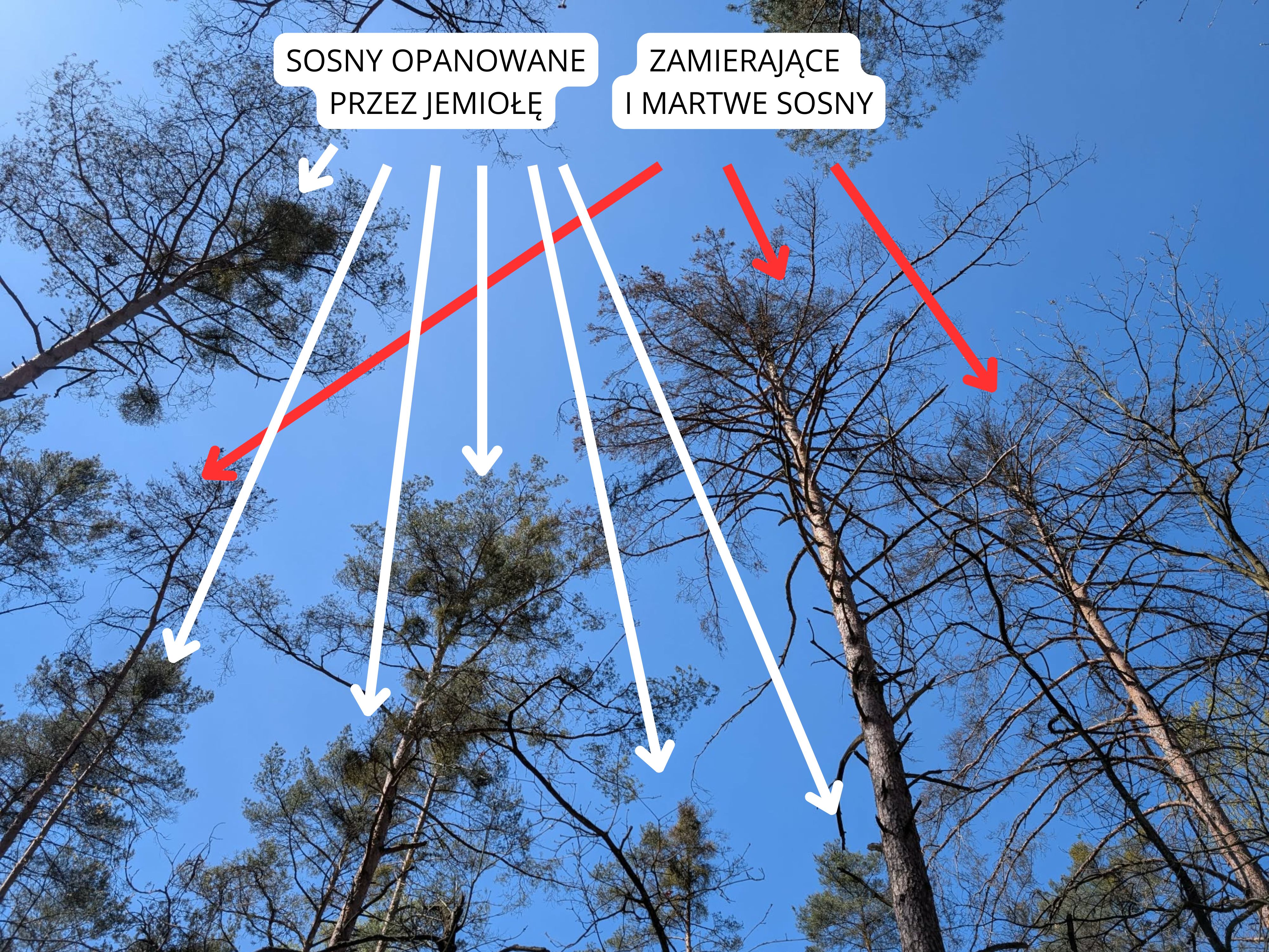 Główną przyczyną zmian jest stan zdrowotny rosnących tam sosen. W ostatnich latach drzewa te zostały silnie opanowane przez jemiołę rozpierzchłą. Choć kojarzy nam się ona głównie z dekoracją, dla sosny jest groźnym półpasożytem, który odbiera drzewu wodę oraz niezbędne sole mineralne. Osłabione w ten sposób lasy znacznie gorzej znoszą coraz częstsze okresy wysokich temperatur i długotrwałe braki opadów. W efekcie kondycja tutejszych sosen uległa gwałtownemu pogorszeniu i wiele z nich zaczęło zamierać (fot. 1-3.).