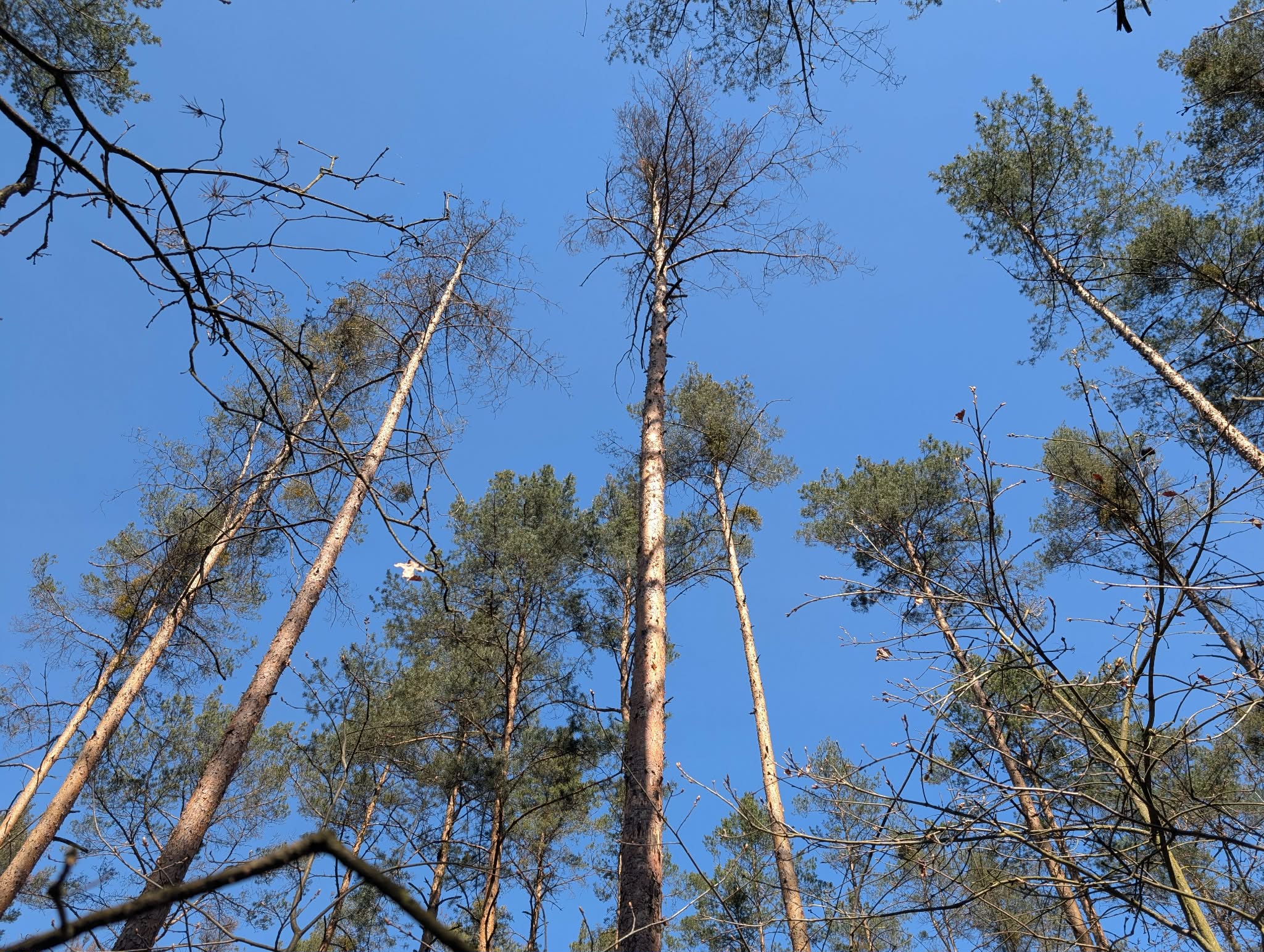 Fot. 2. Sosny opanowane przez jemiołę, zamierające i martwe (fot. Nadleśnictwo Celestynów)