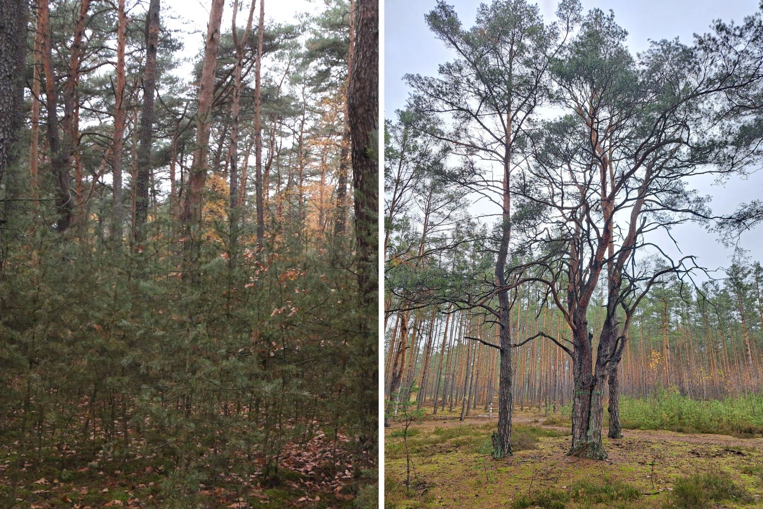 Fot.1 i 2. Młode sosny i jedno z drzew krajobrazowych, które pozostaną niewycięte (fot. M. Skarzyński)