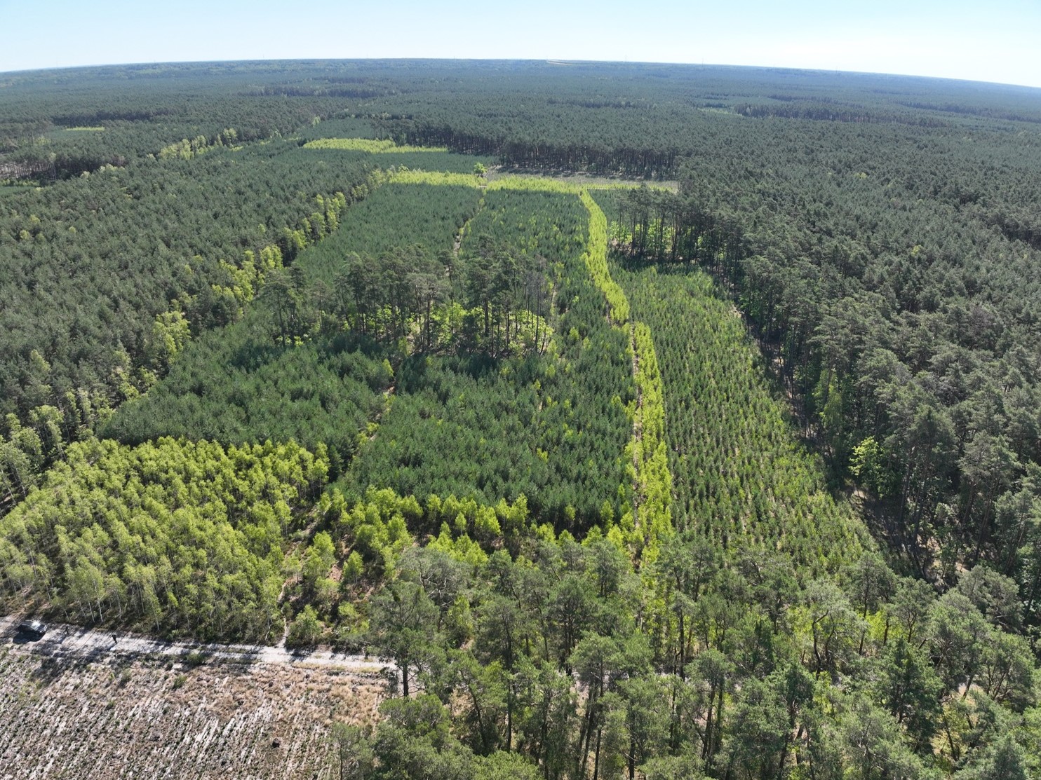 Pierwszym etapem prac jest ścinka drzew na powierzchni 2,61 ha. Następnie, po przygotowaniu gleby, w 2026 r. zostaną posadzone młode drzewa - głównie sosny, a także brzozy i gatunki biocenotyczne (jarzęby), czyli takie, które wpływają pozytywnie na różnorodność biologiczną i zdrowotność lasu.
